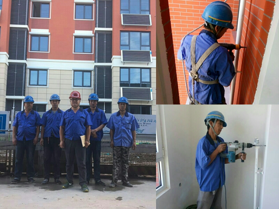 该项目的太阳能支架安装可谓是此工程的一个匠心之作,它突破了以往只是在外墙上打孔安装的方式,在主体结构时期、华业阳光同事就开始了支架安装工作,使后续的外墙保温等流程在支架安装后进行,这样支架就更牢固的悬挂在外墙上。因集热器角钢支架放线定位位置准确,整体美观,受力均衡,得到甲方等领导的一致好评。